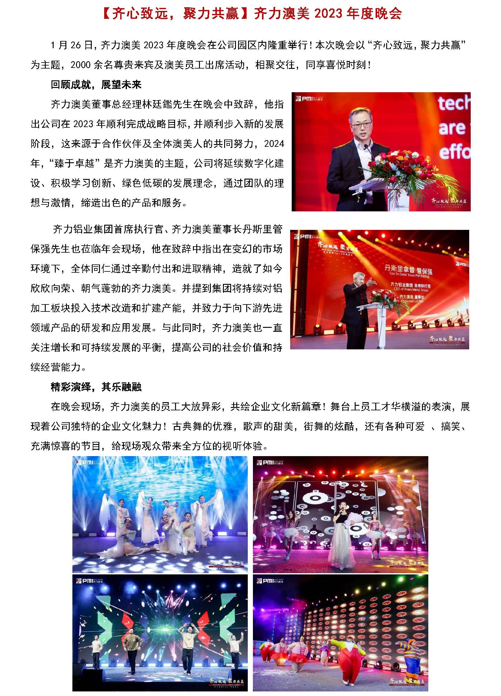 2024. 03. 11齊力澳美,揚帆遠(yuǎn)航!3月10日晚,齊力澳美2023年春茗晚會在佛山隆重舉行,齊力鋁業(yè)集團領(lǐng)導(dǎo),合作伙伴以及齊力澳美全體員工悉數(shù)出席,見證公司全新篇章的華麗開啟。踔厲奮發(fā)·共譜新篇晚會的開篇通過視頻詮釋了齊力澳... -