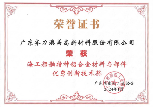 近日,廣東齊力澳美高新材料股份有限公司在廣東省船舶工業協會通過了“海工船舶特種鋁合金材料與部件關鍵技術研究及產業化”項目的科技成果鑒定會,榮獲“優秀創新技術獎”。這是對我司在船舶鋁型材產品研發和創新方面的高度認可,也是對我司船舶產品質量和技術水平的肯定。